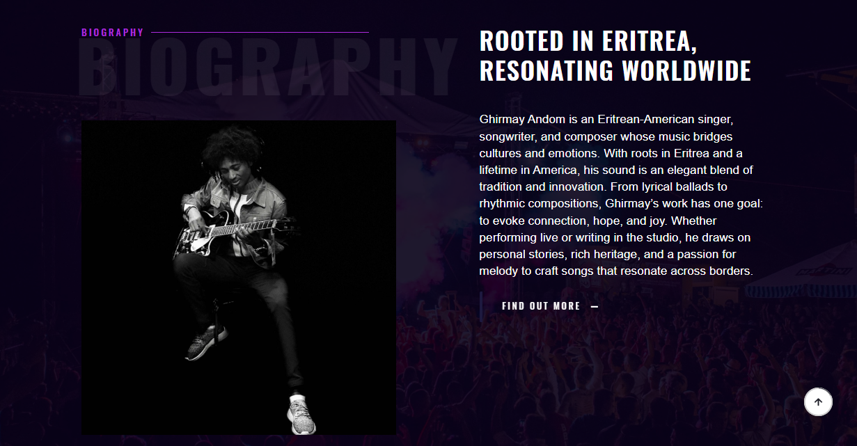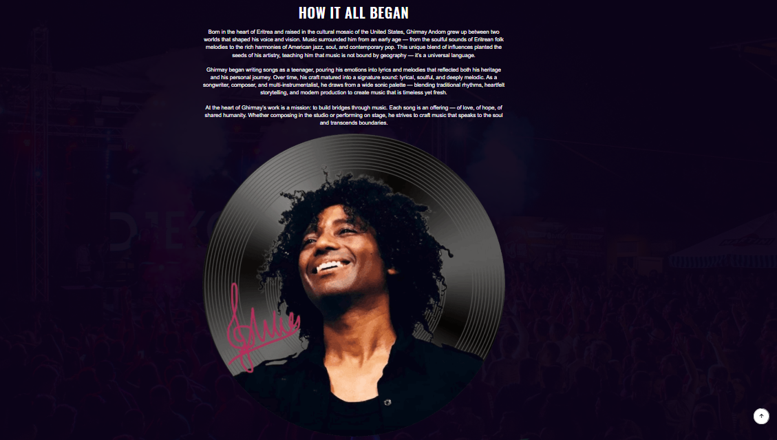 L’expérience utilisateur, fondée sur l’équilibre entre sobriété visuelle et richesse sonore, a permis à Ghirmay Andom de présenter son univers artistique avec authenticité et élégance. Le site est désormais un outil central de communication pour ses concerts, projets et sorties musicales.